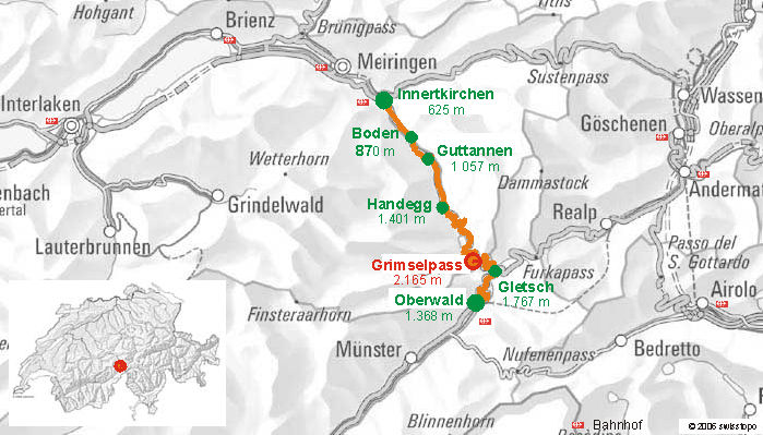 Meiringen. Von dort mit der Meiringen-Innertkirchen-Bahn (MIB) nach Innertkirchen.Mit dem Auto: Von Bern über Thun und Interlaken nach Meiringen, von dort weiter in Richtung Grimselpass. Oder von Luzern über den Brünigpass bis Meiringen, weiter nach Innertkirchen. Nach Oberwald: Mit der SBB bis Brig, dort umsteigen in die Matterhorn-Gotthard-Bahn bis Oberwald. Oder mit der SBB auf der Gotthardstrecke bis Göschenen, umsteigen nach Andermatt, von dort mit der Mattherhorn-Gotthard-Bahn durch den Furkatunnel nach Oberwald. Mit dem Auto: Von Norden über Bern-Thun-Kandersteg-Autoverladung Lötschberg nach Brig, von Westen durch das Rhônetal bis Brig; von Brig weiter nach Ulrichen. |