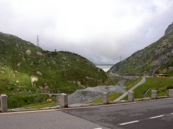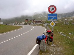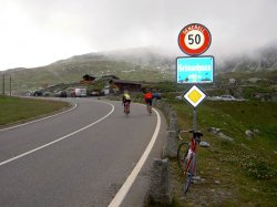 Doch nun zum Radfahren, der Grimsel lässt sich mit Susten- und Furkapass zu einer schönen Pässerunde verbinden, ist aber auch Start oder Ziel der Veloroute 8, der Aareroute. Die längere Seite ist auch die interessantere Seite des Grimsel. In Innertkirchen, durch sechs Kilometer Straße und die Aareschlucht vom Sherlock-Holmes-Ort Meiringen entfernt, geht es los. Etwa einen Kilometer lang kann man sich einrollen, dann wird das Tal enger und die Straße steiler. 5,5 km nach Innertkirchen erreicht man die nächste Siedlung, den Weiler Boden, der zur Gemeinde Guttannen gehört. Das Tal ist nun wieder etwas weiter geworden, die Straße dagegen nach einer kurzen Flachpassage steiler, etwa 8 Prozent beträgt die Steigung auf den nächsten zwei Kilometern. Zwei Serpentinen sorgen für Abwechslung, ehe kurz nach dem Passieren der 1.000m-Marke auf einer neuerlichen Talweitung das Dorf Guttannen im Blickfeld auftaucht. Guttannen ist die flächenmäßig größte Gemeinde des Berner Oberlandes, von den 200 km² sind allerdings über 90 % unfruchtbare Eis- und Felslandschaft. Wenn man Pech hat, merkt man sehr deutlich, welches Naturphänomen das Dorf so oft wie kaum einen anderen Ort in der Schweiz im Griff hat: Der Föhn. Wenn Südwestwetterlagen herrschen, wirkt der Grimselpass wie eine Düse, und das Tal wie ein Kanal, durch den die Winde beschleunigt werden. Dagegen anzuradeln ist wirklich kein großer Spaß – 50–60 Föhntage zählt man hier im Schnitt, an solchen Tagen sollten man vielleicht lieber über die Große Scheidegg oder den Sustenpass fahren. Für die Einwohner sind jedoch die Gefahren ungleich größer: Der Fallwind sorgt für klare Sicht, einen wolkenfreien Himmel aber auch für Trockenheit. Ähnlich wie Meiringen ist auch Guttannen mehrmals abgebrannt, da selbst kleine Funken genügen, um ein Feuer zu entfachen, das schnell auf das ganze Dorf übergreift. Und im Gegensatz zu Meiringen ist hier der häufigste Baustoff immer noch Holz (Bild 1). Bei Föhn herrscht deshalb Rauchverbot, in den Sommermonaten patroulliert in Föhnnächten die sogenannte "Föhnwache" durch den Ort, außerdem ist jeder Einwohner zwischen 21 und 50 Jahren zum Feuerwehrdienst verpflichtet. Sollte also am Reisetag der Föhn das Tal hinunterblasen, beginnt nun für die Fahrradfahrt über den Grimsel der härteste Teil. Man verlässt Guttannen auf einer langen Gerade, die noch nicht sehr stark ansteigt (Bild 2). Erst wenn das Tal wieder enger wird, beginnt die Straße steiler zu steigen. Zwischen sieben und neun Prozent sind es nun, geradewegs nach Süden verläuft das Tal, hier ist also die "Düse" für den Grimselföhn. Der Wald wird lichter, Waldinseln wechseln sich mit Einzelbäumen ab. Ein längerer Lawinenschutztunnel folgt, danach blickt man auf zwei Serpentinen, die die nächste Geländestufe überwinden. Oberhalb der Serpentinen liegt Handegg, mit dem Hotel Handeck und der steilsten Standseilbahn der Welt: Sie führt zum 1.805 m hoch gelegenen Gelmersee, mit einer Steigung von über 106 %. Nun, auf der Straße wird es jetzt auch steil, glücklicherweise jedoch nicht ganz so steil. Ein Zehntel reicht auch schon, mit knapp 11 % umgeht man auf der alten Passstraße einen langen und steilen Tunnel. Bild 3 zeigt einen Rückblick auf den Talkessel von Handegg (das Hotel liegt ganz hinten an der Straße), Bild 4 ist auf der Tunnelumgehung aufgenommen (das Kopfsteinpflaster ist problemlos zu befahren. Langsam ändert sich die Landschaft, mehr und mehr dominiert der blanke Granit des Aaremassivs die Szenerie. Und dazu der Beton der Staumauer des Räterichsbodensees. Beeindruckende 94 m hoch, verleiht sie der Landschaft geradezu einen unwirklichen Eindruck, insbesondere von unten (Bild 5). Zwei Serpentinen (Bild 6) weiter steht man dann am Rand der Mauer. Der Kilometer entlang des Sees ist eine kurze Erholungsphase (Bild 7 ist schon nach dieser Erholungsphase aufgenommen), ehe man wiederum nach zwei Serpentinen die Staumauer des nächsten Sees, des Grimselsees erreicht. Hier kann man abbiegen zum Grimselhospiz, das auf dem Gipfel des Nollen auf der anderen Seite der Staumauer residiert (Bild 8). Es ist allerdings nur der Neubau des Hospizes, das alte Hospiz liegt, wie die alte Passtraße und der Säumerweg, versunken im Wasser auf dem Boden des Grimselsees. Bei schönem Wetter kann man über die Staumauer hinweg großartige Blicke auf die Gipfel des Berner Oberlandes genießen, bei schnell ziehenden Wolken ist es jedoch Glückssache, den Auslöser zur richtigen Zeit zu drücken (Bild 9). Nach einer kurzen Strecke entlang des Sees sind nun die letzten Höhenmeter bis zur Passhöhe zu überwinden. Vier Serpentinen sind es noch, sie bieten immer wieder beeindruckende Blicke über die künstliche Seenlandschaft (Bild 10) und hinein ins Herz des Berner Oberlandes. Karge Landschaft, ein wenig Wiese und viel Granit prägen das Bild, andere Farbtupfer sind die verschiedenen Verkehrsmittel (Bild 11, Bild 12). Eine letzte Serpentine noch, und man ist oben. Kioske, Hotel und Restaurants und viele Parkplätze – an schönen Sommerwochenenden ist es für die Auto- und Motorradfahrer mitunter ziemlich schwierig, hier noch einen freien Platz zu ergattern. Viel Natur wird geboten hier oben, Wanderwege, Klettersteige, ein Murmeltierpark oder der Totensee auf der Passhöhe (Bild 13). Ein lohnenswerter Abstecher von der Passhöhe ist das kleine Sträßchen zum Oberaarsee, wer dieses noch auf sich nimmt, muss bis zu 12-%-ige Steigungen überwinden, wird aber mit großartigen Blicken auf Lauter- und Finsteraarhorn und den Oberaargletscher belohnt. Ansonsten geht führt die Passstraße entlang des Totensees und dann auf der kurzen Abfahrt hinab ins Wallis. Der erste Teil der Südseite des Grimselpasses gleicht der Westseite des Furkapasses. Von Oberwald bis Gletsch geht es relativ gleichmäßig steigend an der jungen Rhône entlang nach oben. In Gletsch teilt sich der Weg: Entweder gelangt man über den Furkapass nach Andermatt