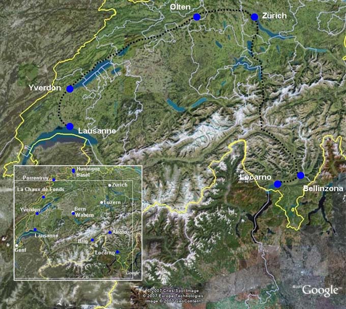 vor Zürich gemacht, auf der Fahrt war das Rad entpackt. Der Zug war bis Yverdon sehr voll, danach bis Zürich ziemlich leer. Der IR von Zürich nach Locarno war dafür fast die ganze Zeit relativ leer. Der hatte auch noch einen ordentlichen Gepäckwagen, in den schon noch zwei Räder mehr gepasst hätten. Bei dem Wetter war es eine sehr schöne Zugfahrt, duch Zug, am Zuger See entlang, Schwyz, die Gotthardstrecke rauf und runter und schließlich nach Locarno. Dort angekommen wuchtete ich das Rad auf den Bahnsteig und stellte fest: Hier ist es wirklich deutlich wärmer als in Lausanne. Dann fuhr ich zur JH, checkte ein, und zurück gings zum Bahnhof, hatte ja noch was vor heute abend. Glücklicherweise hatte ich ja gestern eine Tageskarte gekauft, so war die Fahrt nach Bellinzona und zurück kein Problem. |
